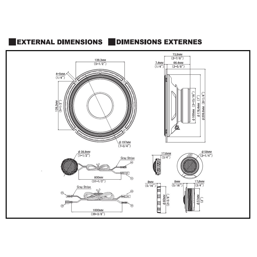 Размер НЧ динамика: 20 см (8”) • 2.5 см (1“) Твитеры с поворотным корпусом • Сертификация Hi-Res Audio (до 40 кГц) • Материал диффузора из полипропилена, стекловолокна и слюды • Легкая конструкция с высокой выходной мощностью и низким уровнем искажений • Фирменный подвес High-Amplitude Multi-Roll (HAMR) • Максимальная мощность: 260 Вт • Мощность RMS: 85 Вт • Диаметр выреза: окружность низкочастотного динамика: 178,4 мм • Монтажная глубина низкочастотного динамика: 66,4 мм • Монтажная высота низкочастотного динамика: 7,4 мм • Магнит низкочастотного динамика: 100,0 мм • Диаметр выреза (скрытое крепление) твитера: 51 мм • Монтажная глубина твитера: 17,6 мм • Монтажная высота твитера: 8 мм • Диапазон частот: 55 Гц - 40 кГц (сертифицирован Hi-Res Audio) • Импеданс: 4 Ом • Чувствительность: 89 дБ/Вт