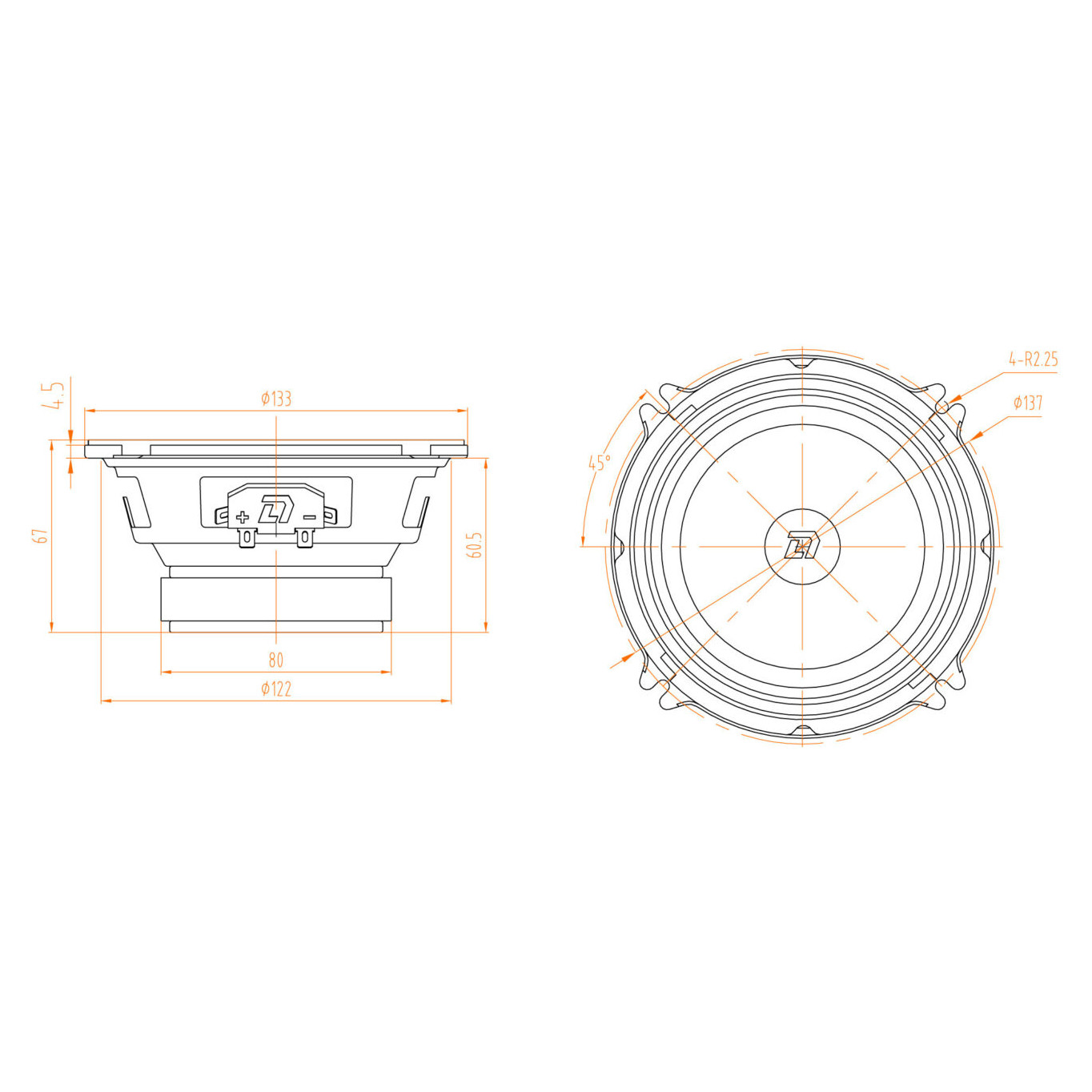 Номинальный диаметр: 130 мм • Номинальная мощность: 65 Вт • Частотный диапазон: 110 - 17 000 Гц • Номинальное сопротивление: 4 Ом • Средняя чувствительность: 91.4 дБ • Диаметр звуковой катушки: 1 дюйм • Fs: 105 • Qts: 0.79 • VAS: 3.1 л • Внешний диаметр: 133 мм • Посадочная глубина: 60.5 мм • Диаметр монтажного отверстия: 122 мм • Расстояние по крепежу: 137.1 мм
