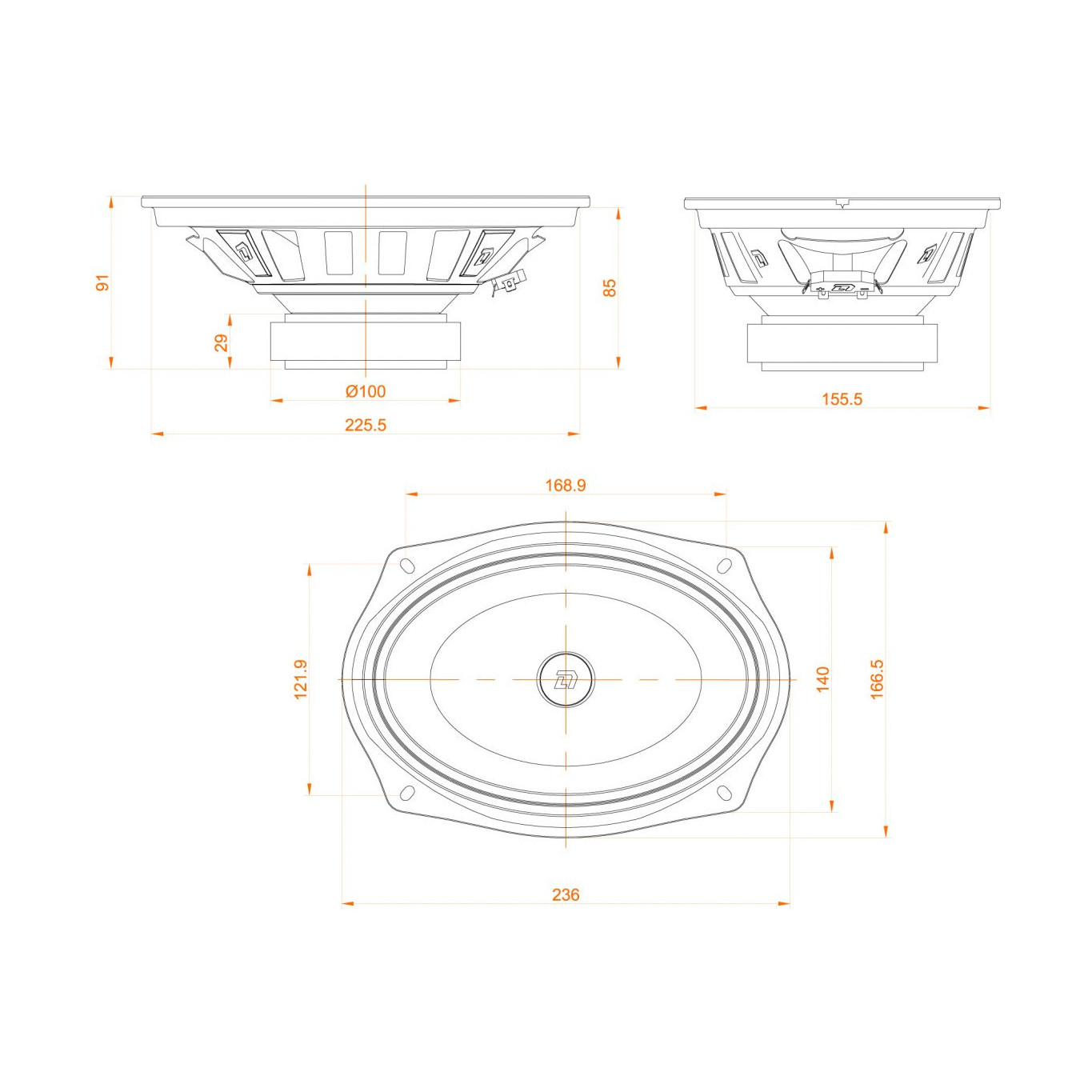 Номинальный диаметр: 150 х 230 мм • Номинальная мощность: 90 Вт • Частотный диапазон: 70 - 15 000 Гц • Номинальное сопротивление: 4 Ом • Средняя чувствительность: 92.7 дБ • Диаметр звуковой катушки: 1 дюйм • Fs: 68 • Qts: 0.72 • VAS: 28.9 л • Внешний диаметр: 236 x 166.5 мм • Посадочная глубина: 85 мм • Диаметр монтажного отверстия: 225.5 x 155.5 мм