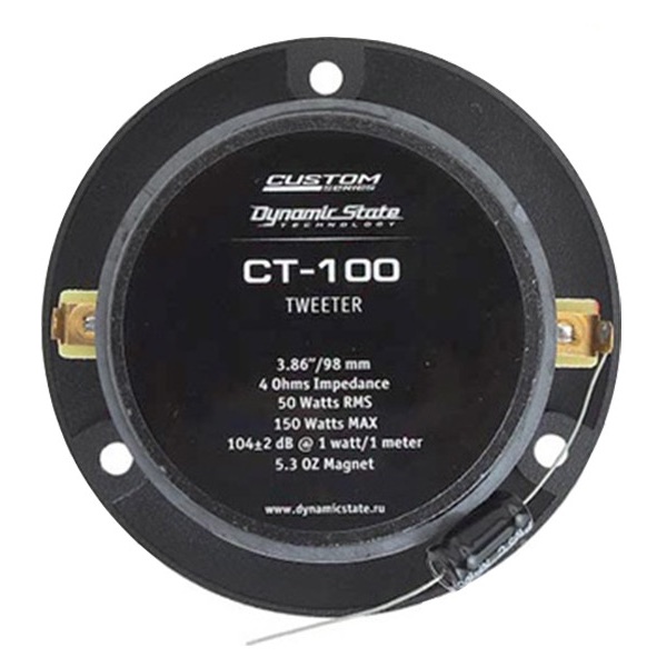 Dynamic State CT-100 – обновлённая версия легендарной модели CT-10.1, ставшей бестселлером в своём сегменте. В версии CT-100 производитель переработал дизайн, добавив хромированные элементы, и применил полимерную диафрагму PEN, что позволило повысить громкость и улучшить качество звучания. Твитер серии CUSTOM сочетает доступную цену, высокую надёжность и выразительную подачу верхних частот в диапазоне 5KHz – 22KHz. Благодаря чувствительности 1042 и мощности 50 Вт RMS (150 Вт MAX) модель обеспечивает яркие, детализированные ВЧ даже при работе с умеренными усилителями. Компактные размеры и монтажная глубина 39 мм делают CT-100 удобным решением для установки в большинство автомобилей.
