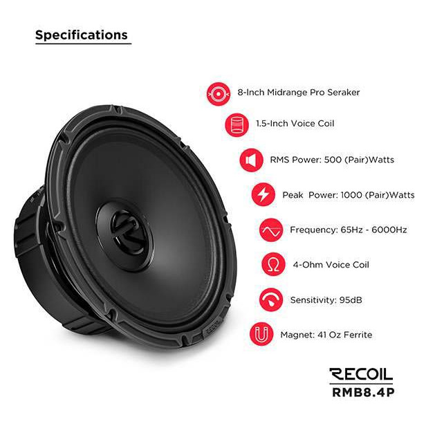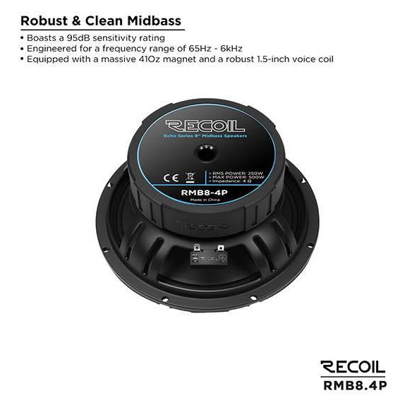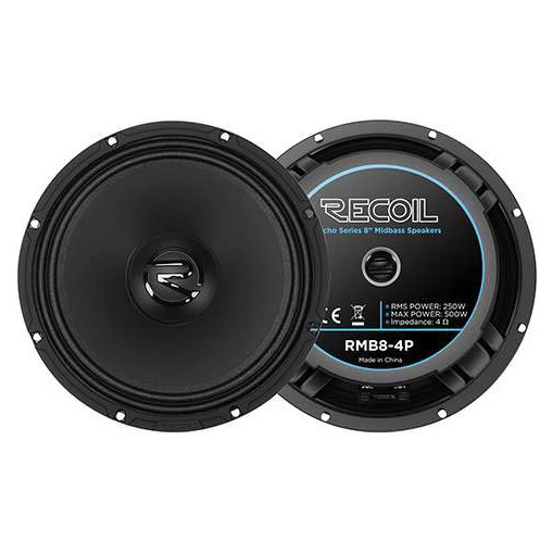 Recoil RMB8-4P – эстрадные динамики диаметром 8 дюймов, разработанные для построения громкой и динамичной аудиосистемы в автомобиле. Модель сочетает высокую чувствительность 95 дБ и номинальную мощность 250 Вт (до 500 Вт в пике), обеспечивая уверенное и чистое воспроизведение в широком диапазоне частот от 65 Гц до 6000 Гц. Сопротивление 4 Ом делает динамик универсальным решением для большинства автомобильных усилителей. Звуковая катушка диаметром 1.5" (38.5 мм) способствует стабильной работе на высокой мощности и надежной передаче сигнала без искажений.