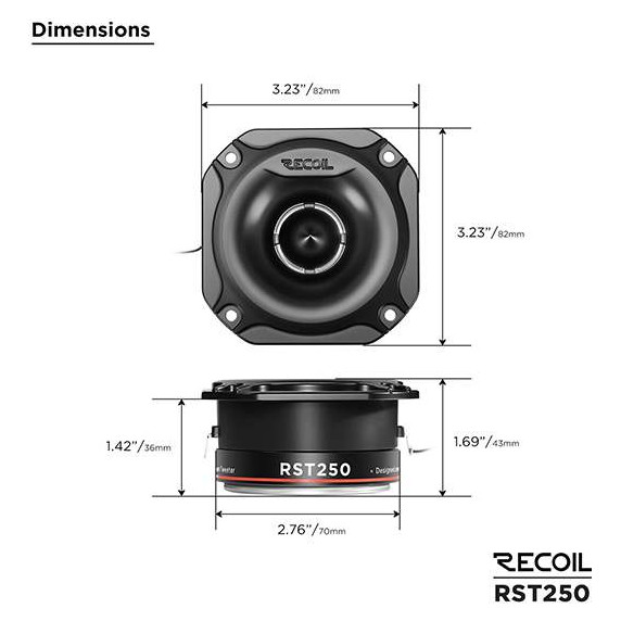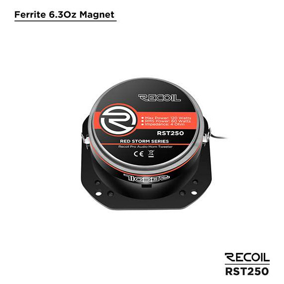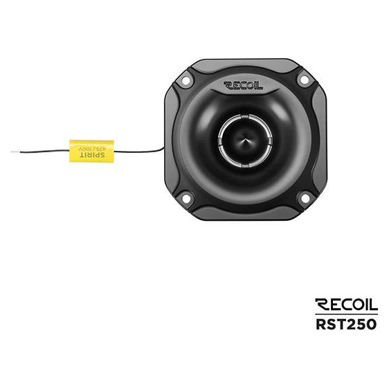 Recoil RST250 – рупорная высокочастотная акустика эстрадного типа, разработанная для яркого и детального воспроизведения верхнего диапазона частот в автомобильной аудиосистеме. Твитеры работают в диапазоне 3000–20000 Гц, обеспечивая четкую передачу вокала и инструментов с выраженной атакой и хорошей разборчивостью. Модель оснащена звуковой катушкой 1.0" (25,5 мм) и имеет сопротивление 4 Ом, что делает её совместимой с большинством автомобильных усилителей. Алюминиевый корпус способствует надежности конструкции и стабильности звучания при высокой нагрузке. Мощность 60 Вт RMS и до 120 Вт в пике позволяет использовать RST250 в составе громких эстрадных систем.