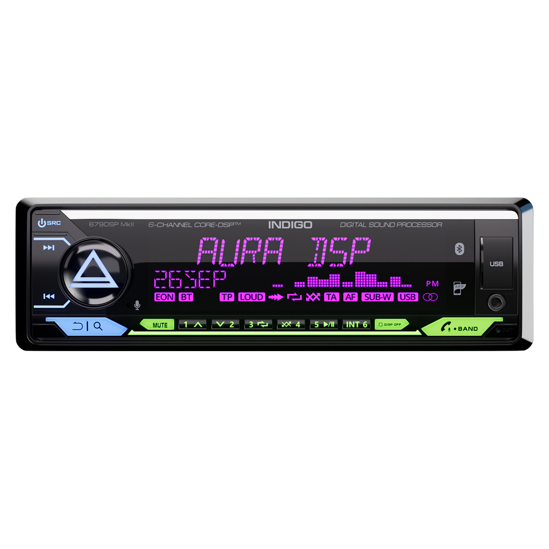 AurA INDIGO-679DSP MkII – это высокотехнологичный 6-канальный процессорный BT/USB/FM ресивер, разработанный для построения качественной аудиосистемы в автомобиле. Устройство оснащено мощной платформой CORE-DSP, поддерживает поканальную временную коррекцию (Time Alignment), 48-полосный параметрический эквалайзер с регулировкой добротности и продвинутый кроссовер с выбором типа фильтра (Баттерворт, Линквиц-Райли, Бессель). Максимальная выходная мощность достигает 4x51 Вт, а RCA-выходы обеспечивают до 6 В амплитуды сигнала без системного шума на низкой громкости. Поддержка Bluetooth 5.3, совместимость с iOS и Android, полная русификация интерфейса, RGB-подсветка и обучение кнопок на руле без внешнего адаптера делают INDIGO-679DSP MkII универсальным решением для автолюбителей, стремящихся к высокому качеству звука и удобству управления.