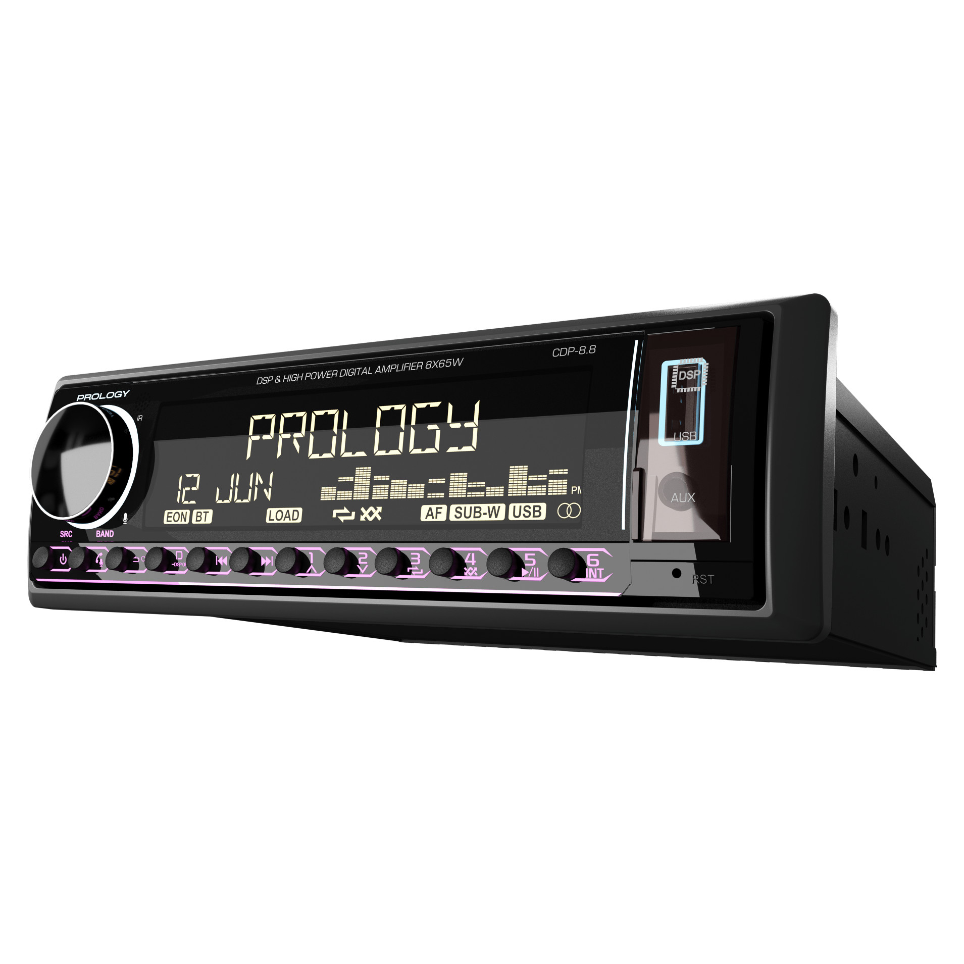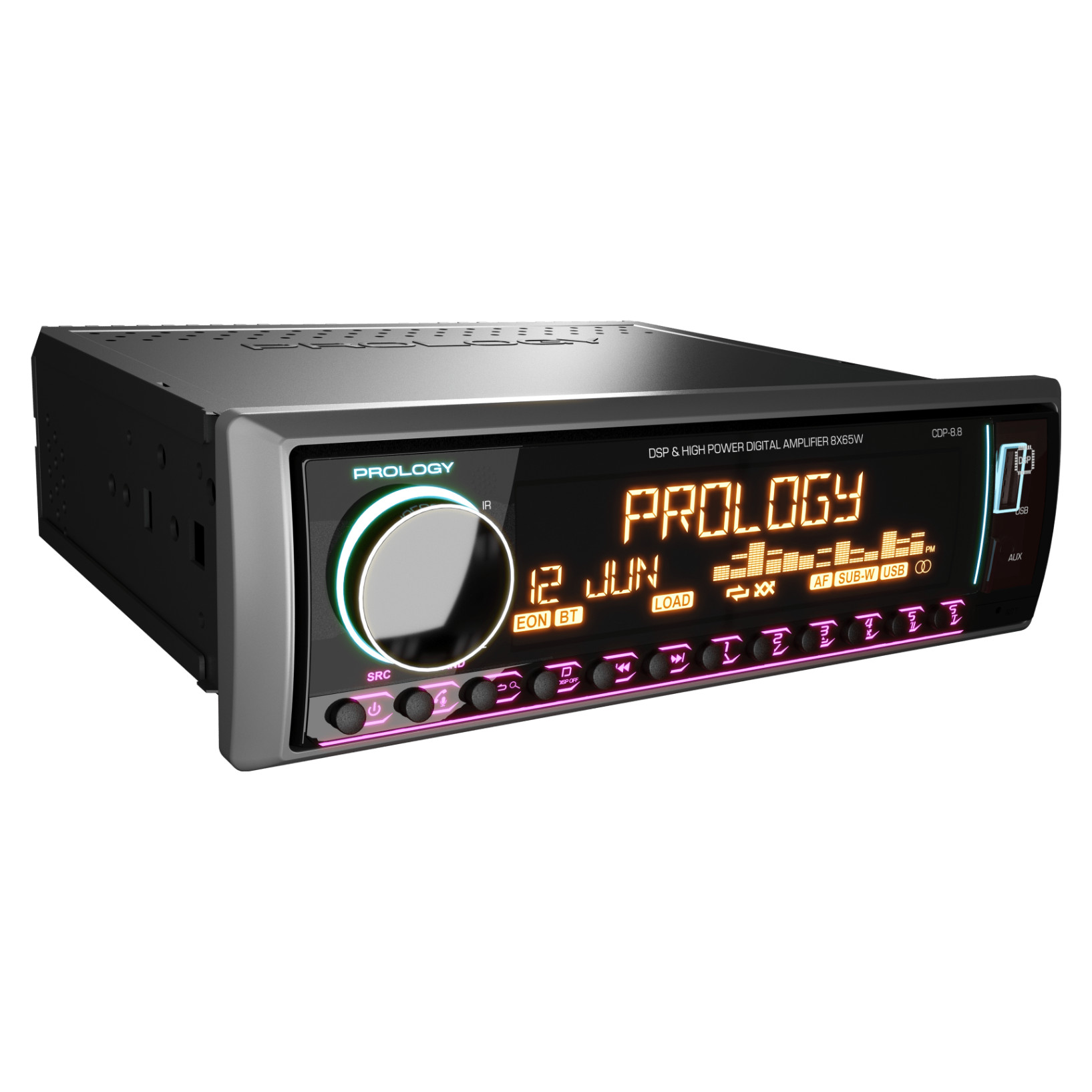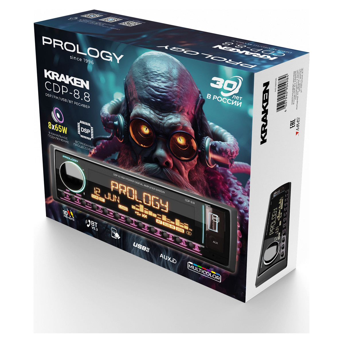 Prology CDP-8.8 Kraken – современный FM/USB/Bluetooth-ресивер с интегрированным DSP-процессором и мощным 8-канальным усилителем D-класса (8 х 65 Вт), предназначенный для построения аудиосистем любой сложности. Устройство сочетает высокую выходную мощность, гибкие возможности звуковой настройки и расширенную коммутацию: 10 линейных выходов (5 пар RCA) позволяют подключать внешние усилители и реализовывать двух- и трехполосные конфигурации. Встроенный DSP с 31-полосным эквалайзером, поканальными временными задержками и регулировкой добротности обеспечивает точную настройку сцены. Управление осуществляется как с панели, так и через приложение Prology Audio (Android/iOS), а поддержка Bluetooth 5.3 позволяет использовать смартфон как полноценный источник сигнала.