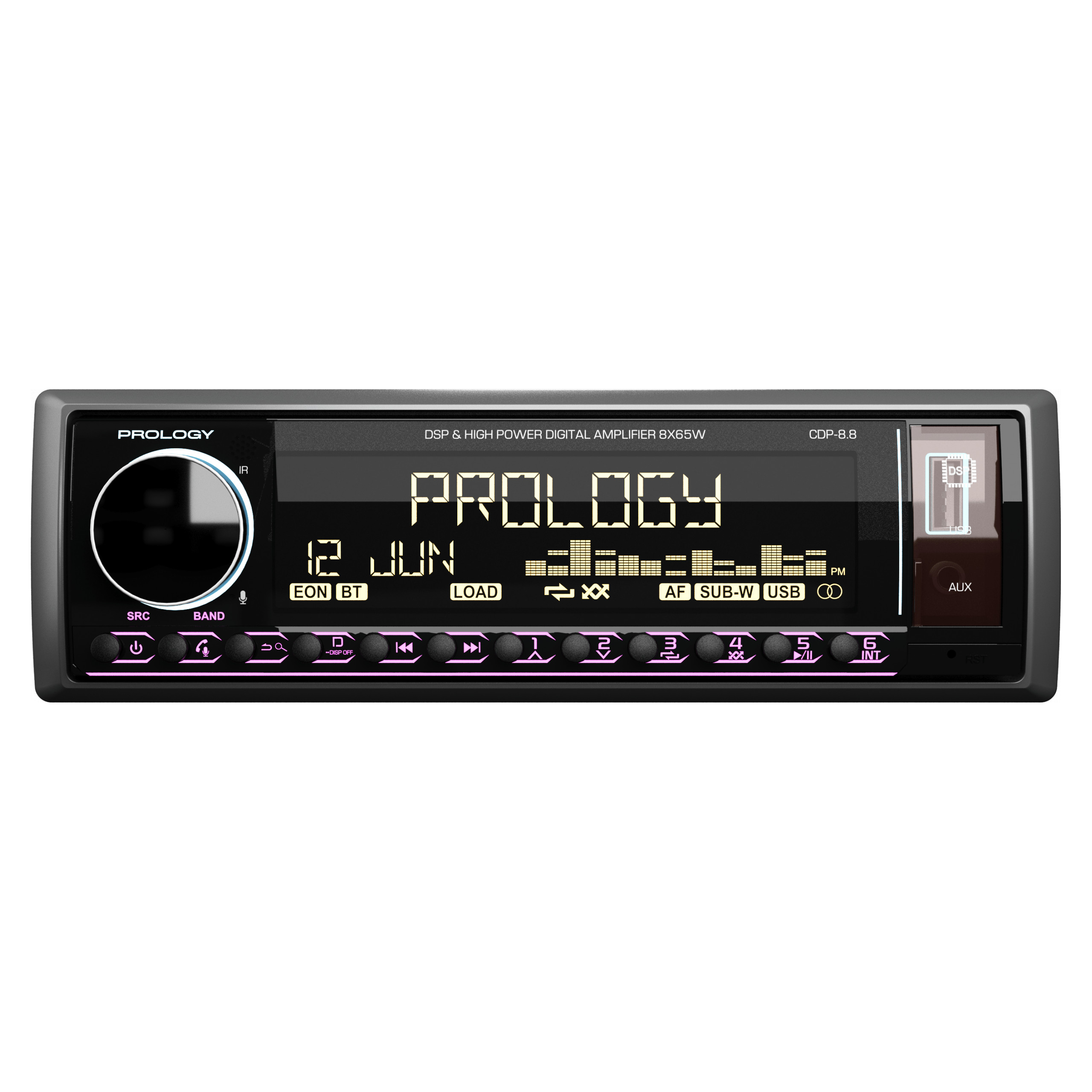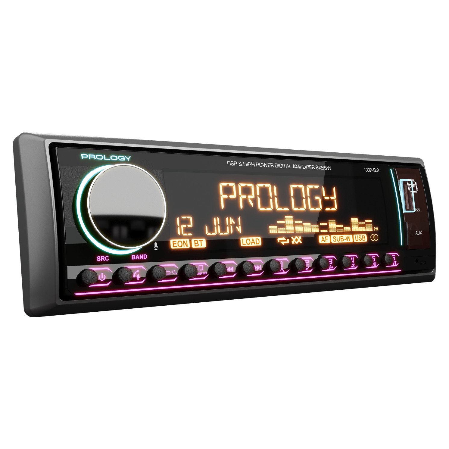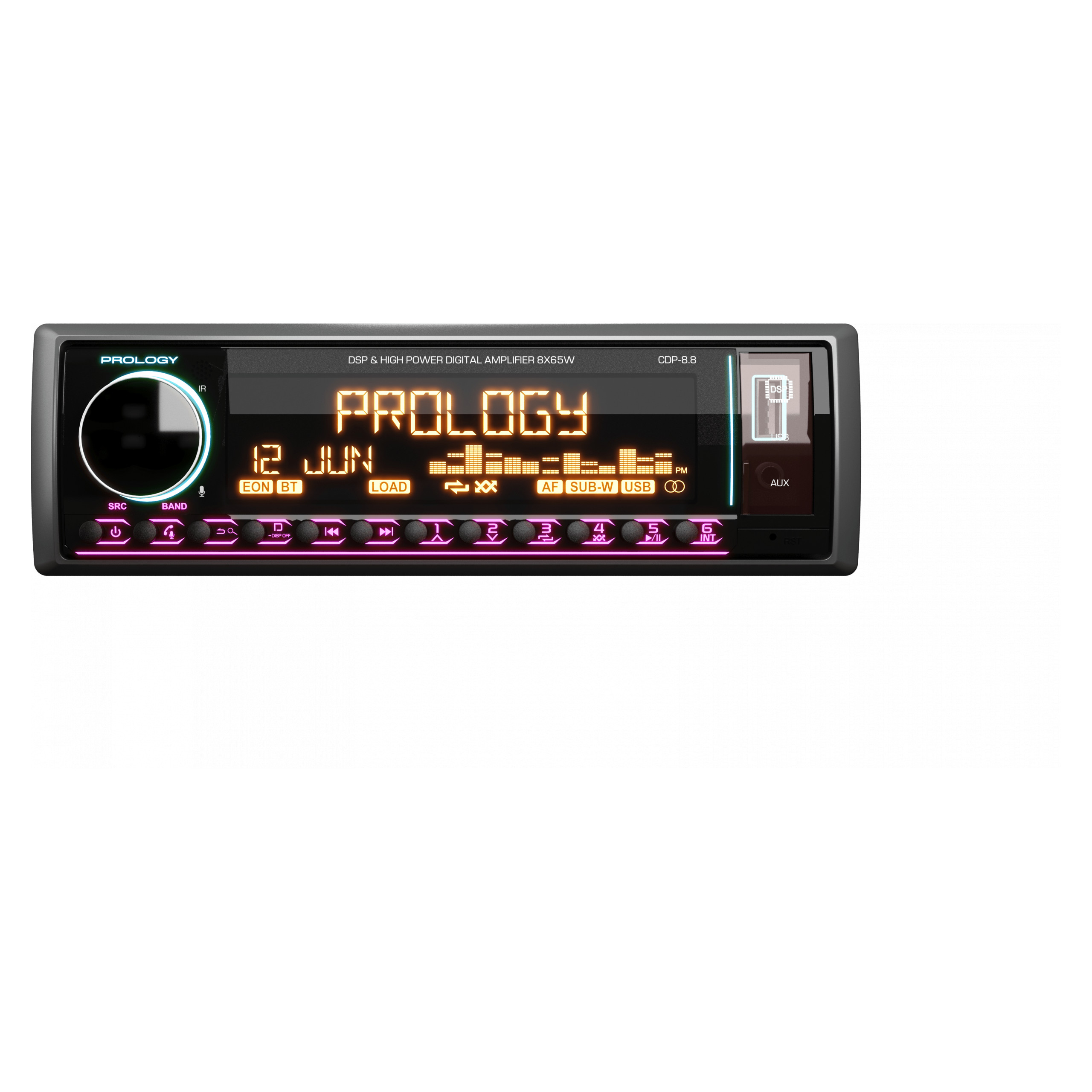 Prology CDP-8.8 Kraken – современный FM/USB/Bluetooth-ресивер с интегрированным DSP-процессором и мощным 8-канальным усилителем D-класса (8 х 65 Вт), предназначенный для построения аудиосистем любой сложности. Устройство сочетает высокую выходную мощность, гибкие возможности звуковой настройки и расширенную коммутацию: 10 линейных выходов (5 пар RCA) позволяют подключать внешние усилители и реализовывать двух- и трехполосные конфигурации. Встроенный DSP с 31-полосным эквалайзером, поканальными временными задержками и регулировкой добротности обеспечивает точную настройку сцены. Управление осуществляется как с панели, так и через приложение Prology Audio (Android/iOS), а поддержка Bluetooth 5.3 позволяет использовать смартфон как полноценный источник сигнала.