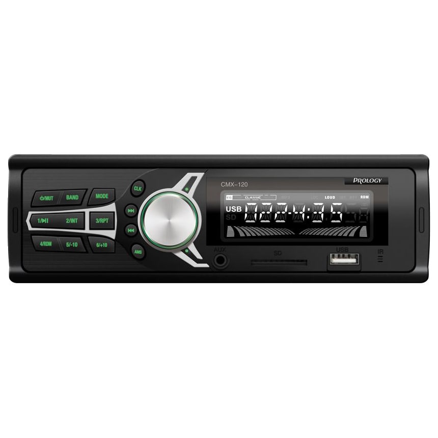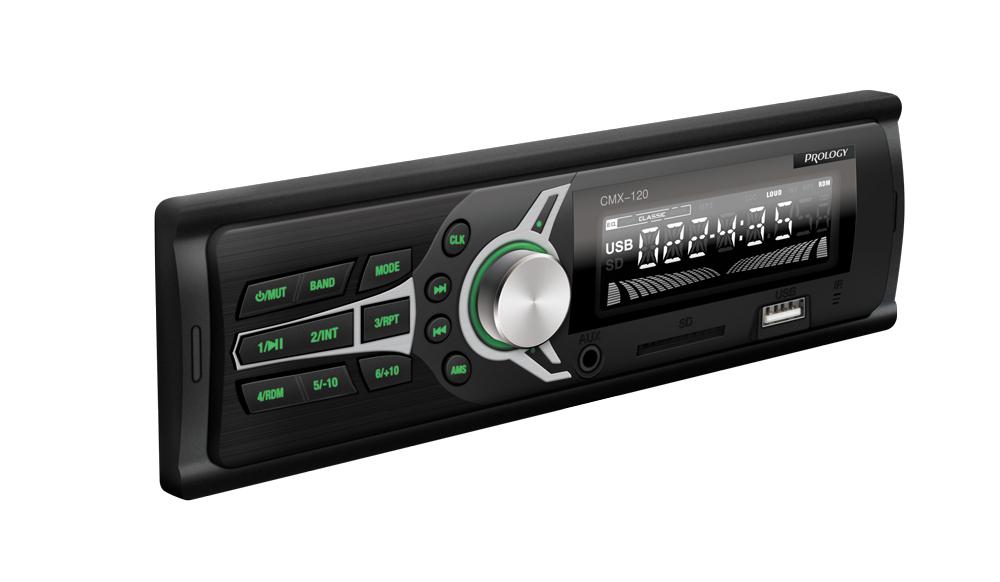 FM SD/USB ресивер Prology CMX-120 дополнит ваш автомобиль самыми необходимыми опциями: воспроизведением музыки и прослушиванием радио. В нём не предусмотрено лишнего функционала, за который непременно пришлось бы платить – это бюджетный FM SD/USB ресивер с простым управлением и оптимальным набором функций. Он выполнен в типоразмере 1DIN, оснащен несъемной лицевой панелью чёрного цвета и имеет зелёную подсветку кнопок. Для удобства в эксплуатации ресивер также комплектуется пультом дистанционного управления.