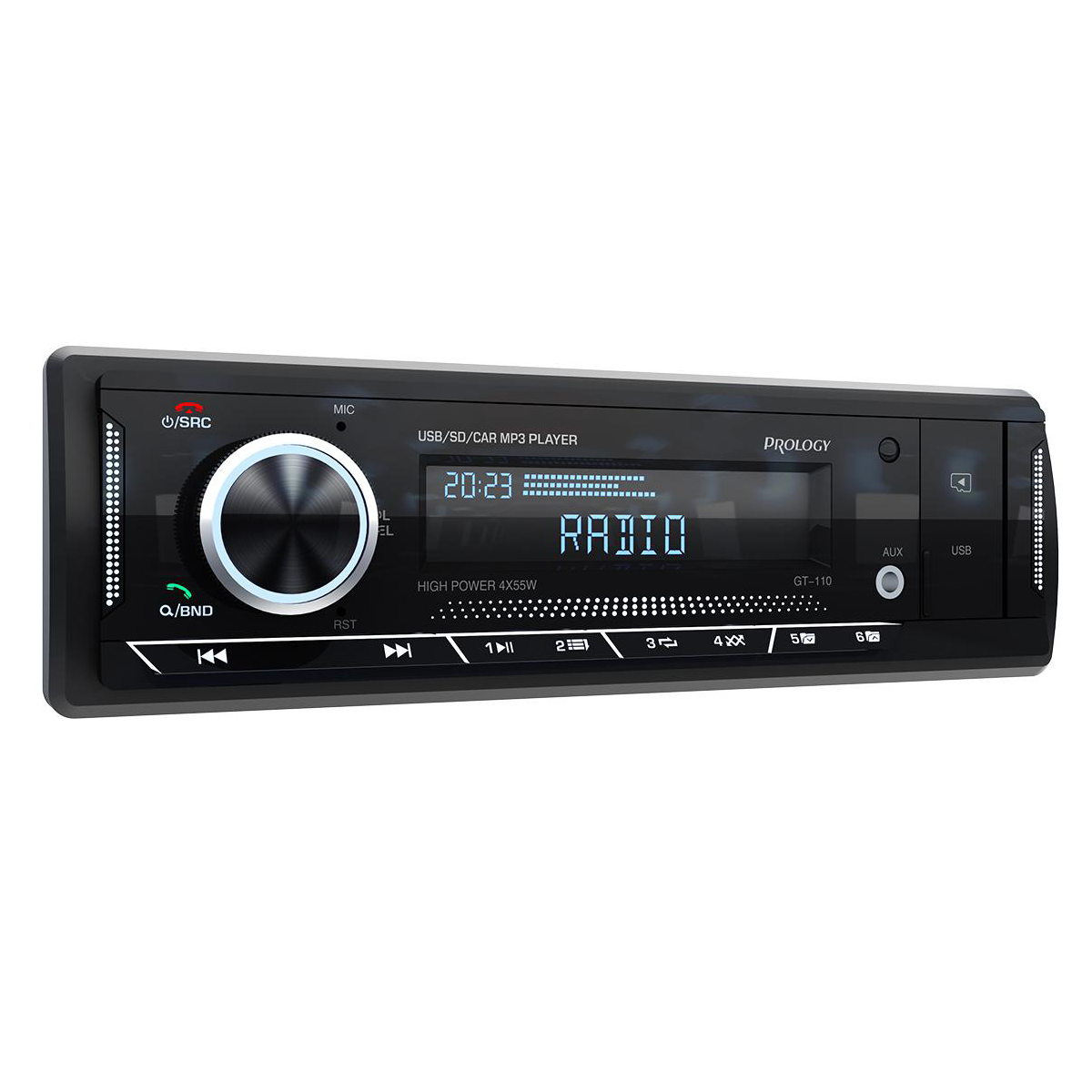 Prology GT-110 – универсальная 1DIN автомагнитола с поддержкой Bluetooth и современным набором функций для воспроизведения музыки, управления звонками и расширенного взаимодействия с мобильными устройствами. Модель оснащена высокоскоростным FM PLL тюнером с памятью на 18 станций и функцией автопоиска, а также фронтальными разъёмами для подключения USB и microSD накопителей объёмом до 128 ГБ. Prology GT-110 воспроизводит аудиофайлы в форматах MP3, WMA, WAV и FLAC, обеспечивая качественное звучание на уровне CD. Встроенный Bluetooth 4.2 с поддержкой профилей A2DP, AVRCP, HFP, HSP позволяет передавать музыку и совершать звонки hands-free. Управление устройством возможно через приложение Prology Link на Android, предлагающее тонкие настройки звука и выбор источника сигнала. Белая подсветка кнопок, минимальная монтажная глубина (100 мм) и совместимость с системой «ЭРА-ГЛОНАСС» делают эту модель привлекательным решением для установки в широкий спектр автомобилей.