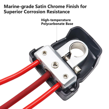 Recoil PBT-1024 – комплект аккумуляторных клемм (положительная и отрицательная) для эффективной и безопасной коммутации силовых кабелей в автомобильных аудиосистемах. Каждая клемма оснащена тремя выходами: один под кабель сечением 0/2/4 AWG и два выхода под 4/8 AWG, что обеспечивает гибкость при подключении нескольких устройств без использования дополнительных распределителей. Клеммы изготовлены из кованой латуни, обладающей высокой проводимостью и устойчивостью к механическим нагрузкам. Матовое хромированное покрытие морского класса обеспечивает защиту от коррозии, а крупные прижимные винты способствуют надёжной фиксации проводов. В комплект входят адаптерные пластины под узкие конусные выводы аккумуляторов, а корпус из термостойкого поликарбоната обеспечивает высокую степень изоляции и механической защиты.