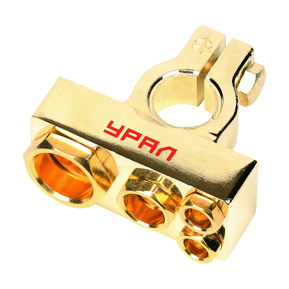 Тип: Аккумуляторная клемма (плюсовая) • Материал: Цинковый сплав с позолотой • Выходы: 1х4 GA (21,2 мм 2)) + 2х8 GA (8,35 мм2)) • Входы: 1х0 GA (53,5 мм2)) • Тип клеммы: Аккумуляторная