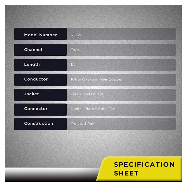 Длина: 30 см • Количество каналов: 2 • Тип проводника: многожильный медный • Содержание меди: 99,99% • Технология: витая пара • Тип разъёма: никелированный RCA с раздвоенным концом • Оболочка: гибкая матовая ПВХ • Серия: Echo RCA • Уровень: начальный (серия RCI Light)