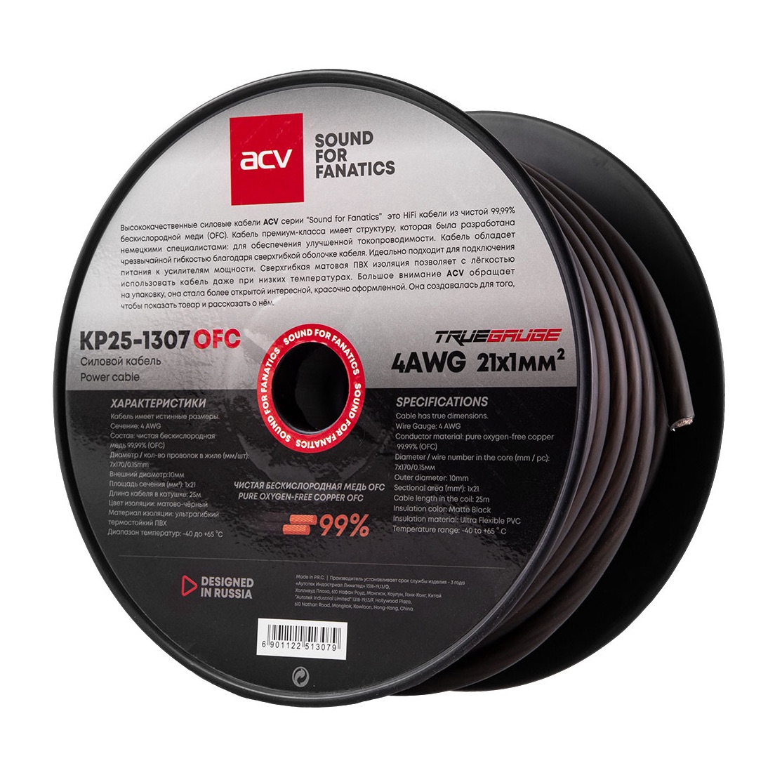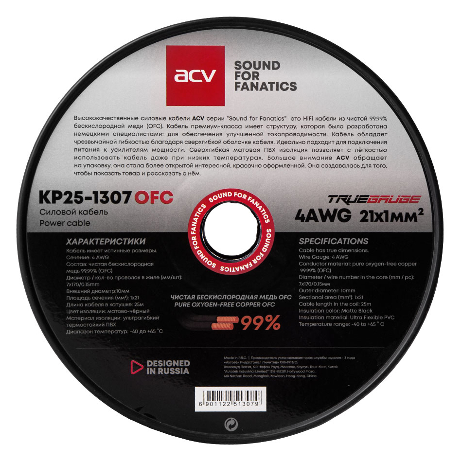 ACV KP25-1307OFC – высококачественный силовой кабель серии "Sound for Fanatics", выполненный из чистой бескислородной меди (OFC) 99,99% глубокой степени очистки. Разработанный немецкими специалистами, он обеспечивает улучшенную токопроводимость и минимальные потери энергии при передаче питания к усилителям мощности. Сверхгибкая матовая ПВХ изоляция устойчива к низким температурам и термонагрузкам, позволяя использовать кабель в диапазоне от -40°C до +65°C без ухудшения характеристик. Истинное сечение 4 AWG (21 мм²) и конструкция 7x170/0.15 мм гарантируют стабильную подачу тока даже при высокой нагрузке. Идеален для профессиональных установок автозвука, требующих надежного питания и долговечной работы.