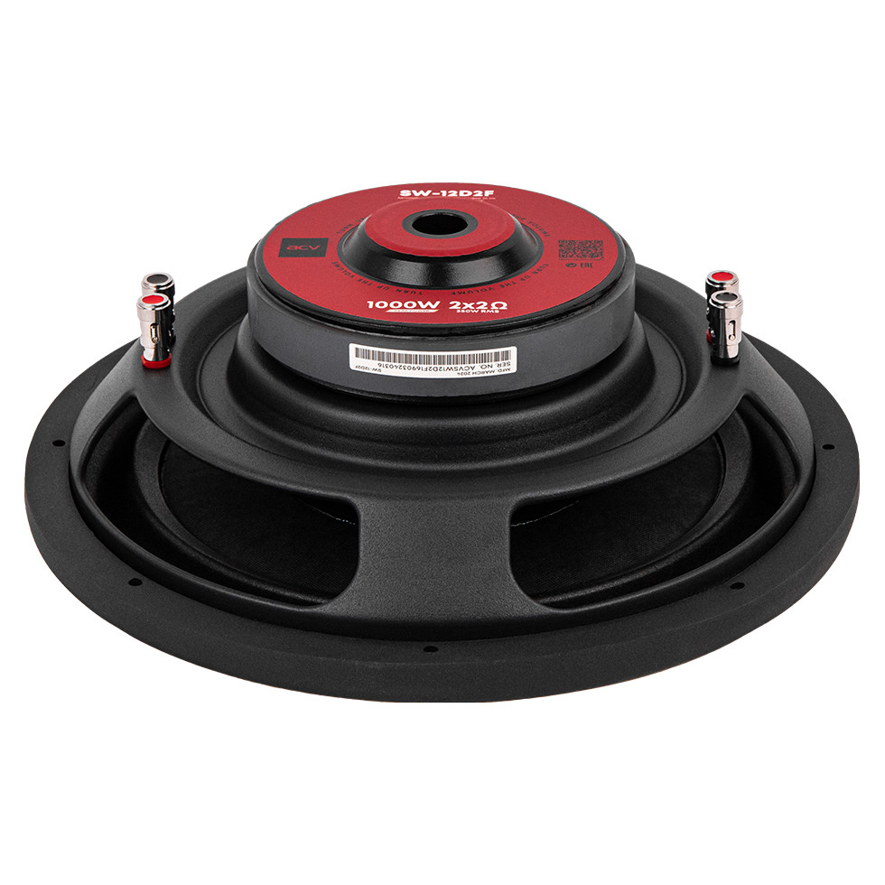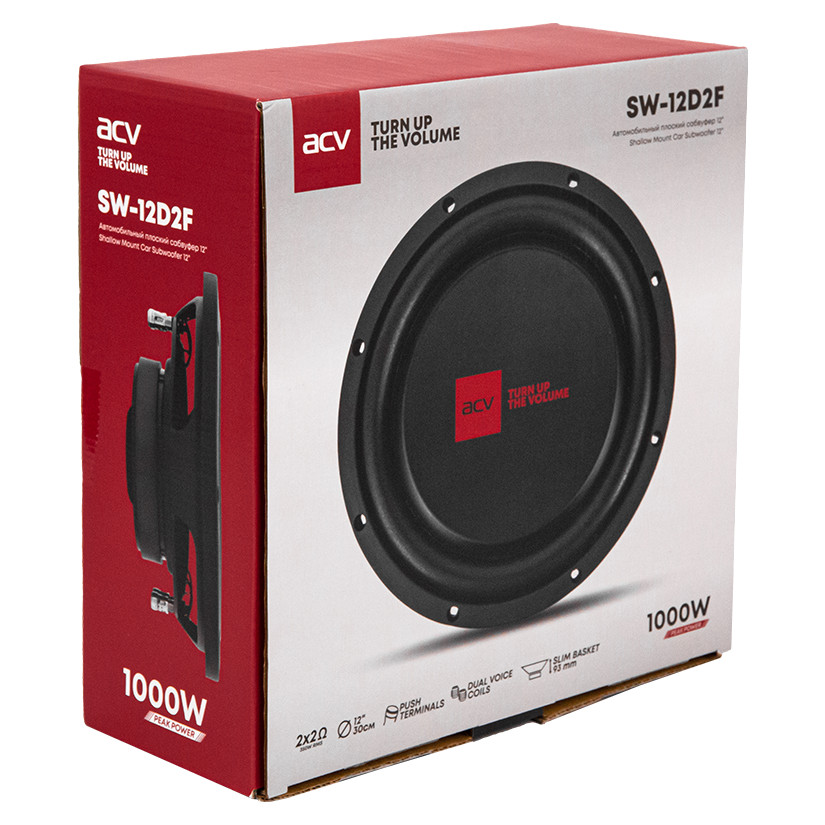 ACV SW-12D2F – плоский 12-дюймовый сабвуфер, разработанный для получения мощного и плотного баса в автомобиле при ограниченном установочном объёме. Модель сочетает RMS-мощность 350 Вт и пиковую мощность 1000 Вт, обеспечивая уверенное воспроизведение низких частот в диапазоне 30–500 Гц. Конструкция основана на проверенных решениях: жёсткий и лёгкий диффузор из непрессованной целлюлозы, высокотемпературная двойная звуковая катушка диаметром 2 дюйма, ферритовый магнит весом 1275 г и прочная стальная штампованная корзина. Монтажная глубина всего 93 мм делает модель оптимальным выбором для компактных корпусов любого типа. Благодаря чувствительности 88 дБ и продуманным параметрам Тиля–Смолла сабвуфер демонстрирует высокую выносливость и стабильную работу даже при интенсивной нагрузке.