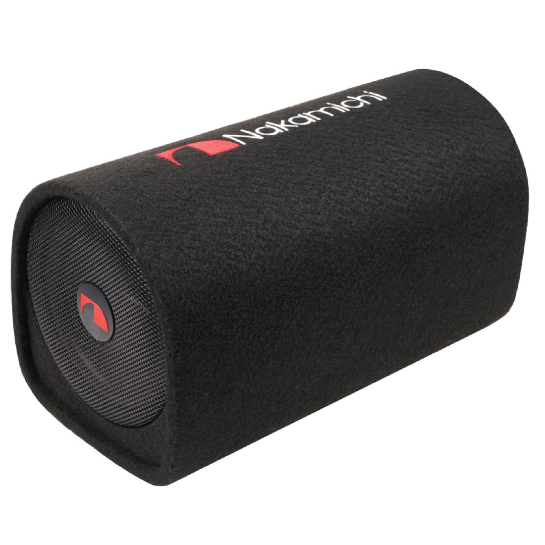 Nakamichi NBT-806A – компактный активный сабвуфер с 8-дюймовым динамиком в фазоинверторном оформлении, оптимизированный для установки в багажник автомобиля. Благодаря цилиндрической форме корпуса с устойчивым плоским основанием, сабвуфер легко интегрируется даже в ограниченное пространство, не теряя в эффективности. Применение фазоинвертора позволяет получить мощный и глубокий бас с минимальными искажениями, не требуя усилителя высокой мощности. Корпус выполнен из МДФ, обтянут черным карпетом с фирменной вышивкой, что придаёт устройству аккуратный и премиальный внешний вид. Усилитель развивает 100 Вт RMS, чего достаточно для создания насыщенного низкочастотного фундамента в штатной или улучшенной аудиосистеме. Сабвуфер подключается через линейный RCA-вход и поддерживает настройку фильтра НЧ в диапазоне 50–200 Гц.