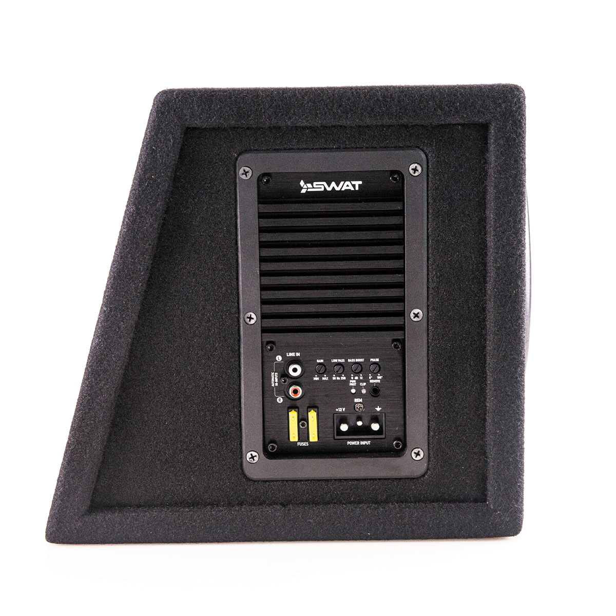 Swat MAS-10VBA – корпусной активный сабвуфер с 10-дюймовым динамиком, созданный для насыщенного и мощного баса в автомобильной аудиосистеме. Модель оборудована встроенным усилителем мощностью 300 Вт RMS и оптимизированным фазоинверторным корпусом объемом 21 литр, что обеспечивает глубокое и управляемое воспроизведение частот от 30 до 250 Гц. Благодаря широкому диапазону входной чувствительности (0,2–8 В) и поддержке как высокоуровневого, так и линейного подключения, сабвуфер легко интегрируется в большинство современных и штатных систем. Устройство оснащено функцией автозапуска, фазовращателем, выносным регулятором уровня и возможностью регулировки баса (до +12 дБ), обеспечивая гибкость настройки под любые предпочтения и условия установки.