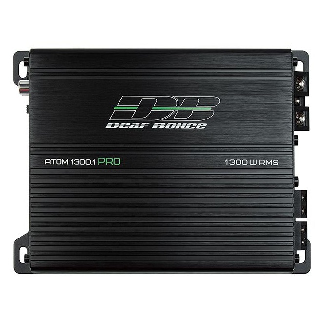 Deaf Bonce Apocalypse Atom 1300 PRO – компактный и мощный моноблочный усилитель класса D, предназначенный для сабвуферных систем, обеспечивающий впечатляющее звуковое давление и глубокий, насыщенный бас. С выходной мощностью до 1300 Вт при нагрузке 1 Ом, он оптимален для работы с сабвуферами серий Machete и Apocalypse. Благодаря высокой эффективности (КПД >85%) и минимальной нагрузке на бортовую сеть, усилитель подходит для инсталляции даже в автомобилях с ограниченным пространством. Устройство построено на модернизированной бразильской схемотехнике второго поколения с четырёхслойной платой, что обеспечивает стабильность работы, надёжную защиту и устойчивость к перегреву. Оснащён встроенными фильтрами и функцией Bass Boost для тонкой настройки под конкретную акустическую систему.