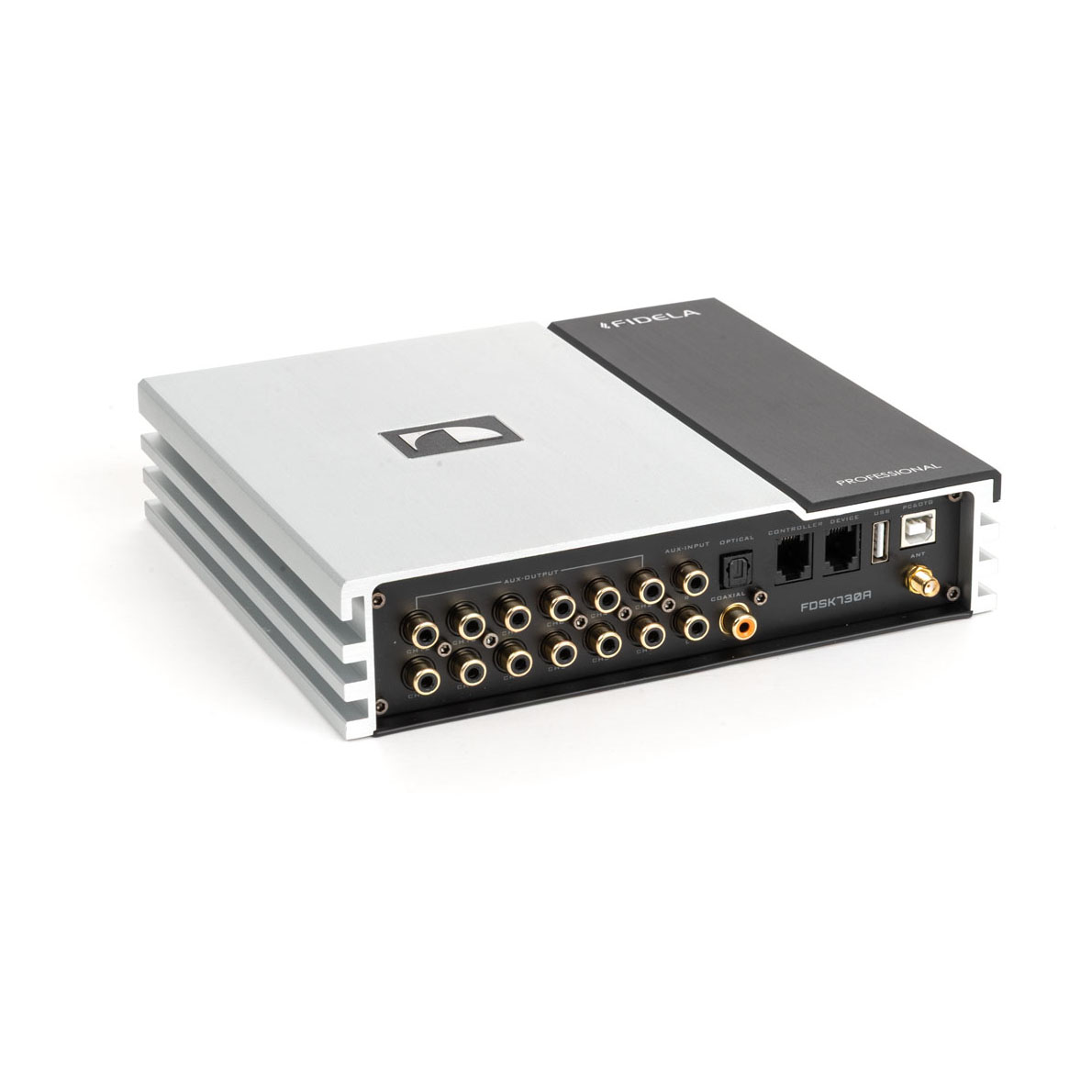 Nakamichi FDSK730A – высококлассный автомобильный 12‑канальный DSP‑процессор с встроенным 10‑канальным усилителем, разработанный для построения систем уровня Hi‑Fi или серьёзного апгрейда штатного звука. Основан на DSP‑чипе Analog Devices ADAU1452, оснащён 10‑канальным высоким входом (High‑Level), 2‑канальным RCA‑входом, цифровыми входами SPDIF (Toslink и Coaxial), поддерживает воспроизведение по USB‑Audio, Bluetooth и с USB‑накопителей. Устройство способно выдавать мощность 4×50 Вт + 4×35 Вт + 2×100 Вт (мостом — до 200 Вт), охватывает частотный диапазон 10–40000 Гц и обеспечивает полноценную настройку звучания: эквалайзер, фильтры, временная коррекция, фазировка и пресеты. Компактный корпус (210×188×48 мм, вес 2,1 кг) включает тороидальный трансформатор питания и качественные компоненты (ЦАП Asahi Kasei, операционные усилители Texas Instruments и др.), что делает FDSK730A стабильным и мощным ядром автозвуковой системы.