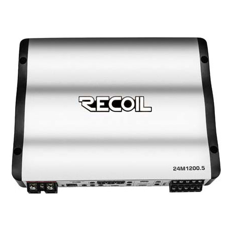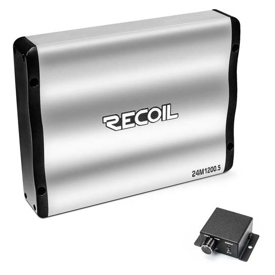 Recoil 24M1200.5 – универсальный 5-канальный усилитель класса D, специально разработанный для аудиосистем с бортовым питанием 24 В, включая катера, спецтехнику и грузовой транспорт. Это полноценное решение для построения аудиосистемы "в одном корпусе": 4 канала для фронтальной и тыловой акустики плюс выделенный канал для сабвуфера. Усилитель обеспечивает мощность до 150 Вт на канал при 2 Ом (CH1-4) и до 600 Вт на сабвуфер (CH5). Влагозащищённая конструкция с герметичным корпусом, одностороннее подключение, автоматическое включение, входы высокого уровня и встроенные фильтры делают его идеальным выбором для инсталляций в условиях повышенной вибрации и влаги. Компактный форм-фактор упрощает монтаж даже в ограниченном пространстве.