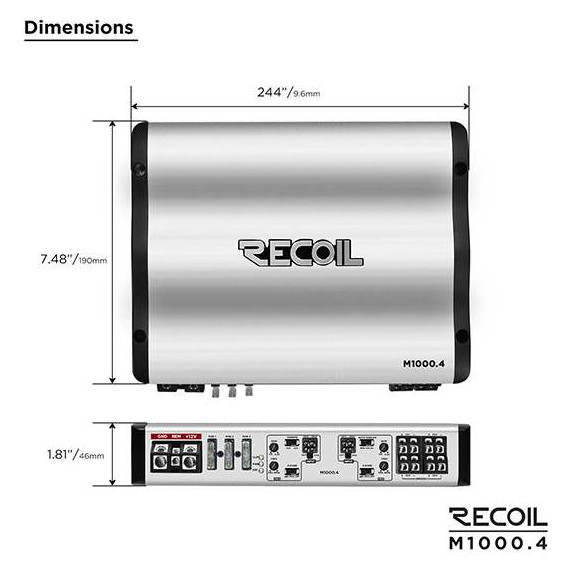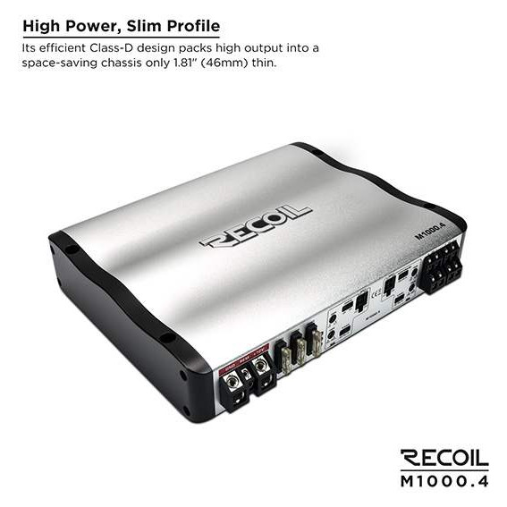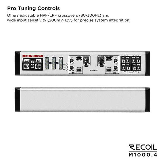 Recoil M1000.4 – 4-канальный автомобильный усилитель, разработанный на базе современных силовых MOSFET-транзисторов International Rectifier, обеспечивающих стабильную работу и эффективную отдачу в любых режимах. Модель поддерживает подключение по высокоуровневому и низкоуровневому входу, что делает её универсальным решением как для штатных, так и для доработанных аудиосистем. Гибкая настройка кроссоверов для каналов канал 1/2 и канал 3/4 (HPF/LPF/FULL) позволяет точно согласовать усилитель с мидбасами, твитерами или сабвуфером. Встроенные схемы защиты от перегрузки, перегрева, перепадов напряжения, короткого замыкания динамиков и DC-offset гарантируют надежность и долговечность системы. Возможность выбора способа включения (VOX/DC/REM) и комплектный проводной пульт дистанционного управления делают установку и эксплуатацию максимально удобной.