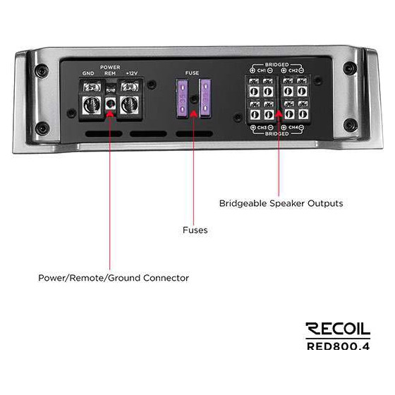 Recoil RED800.4 – четырехканальный усилитель серии RE MOSFET, выполненный по схеме класса AB и рассчитанный на стабильную работу в автомобильной аудиосистеме с питанием 14,4 В. Модель обеспечивает 120 Вт на канал при нагрузке 4 Ом и до 190 Вт на канал при 2 Ом, что позволяет эффективно раскрыть потенциал фронтальной и тыловой акустики. При мостовом подключении усилитель выдает 370 Вт x 2 канала в 4 Ом, что делает его универсальным решением для подключения сабвуферов. Встроенные фильтры высоких и низких частот с широким диапазоном настройки обеспечивают точную интеграцию в систему и гибкую конфигурацию звучания.